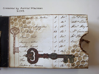 I found the bits of lace in my bit box already dyed to colours that were perfect for this project so that gave me a feel good factor ;D! I arranged all the embellishments, moving them around until I was happy and then stuck them down to the cover. I added a bit of pencil shadowing around the little words.